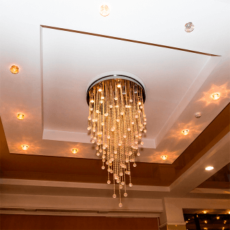 Советуют многоярусные люстры, к примеру, хрустальные, или люстры, которые висят на цепях. Однако, следует учесть, что из-за гранёного хрусталя получается много бликов, а это сильно утомляет глаза.