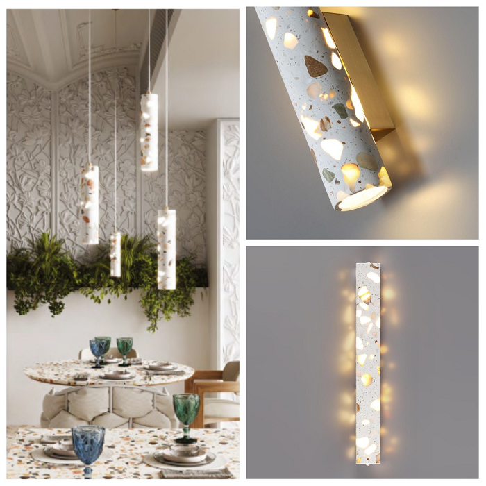Если бюджета на ремонт не хватает на роскошные мраморные полы и дорогую отделку для стен, добавьте роскошь натуральных природных материалов с помощью светильников. Ведь теперь люстры, бра, настольные лампы и торшеры тоже декорированы камнями разных пород или их имитацией.